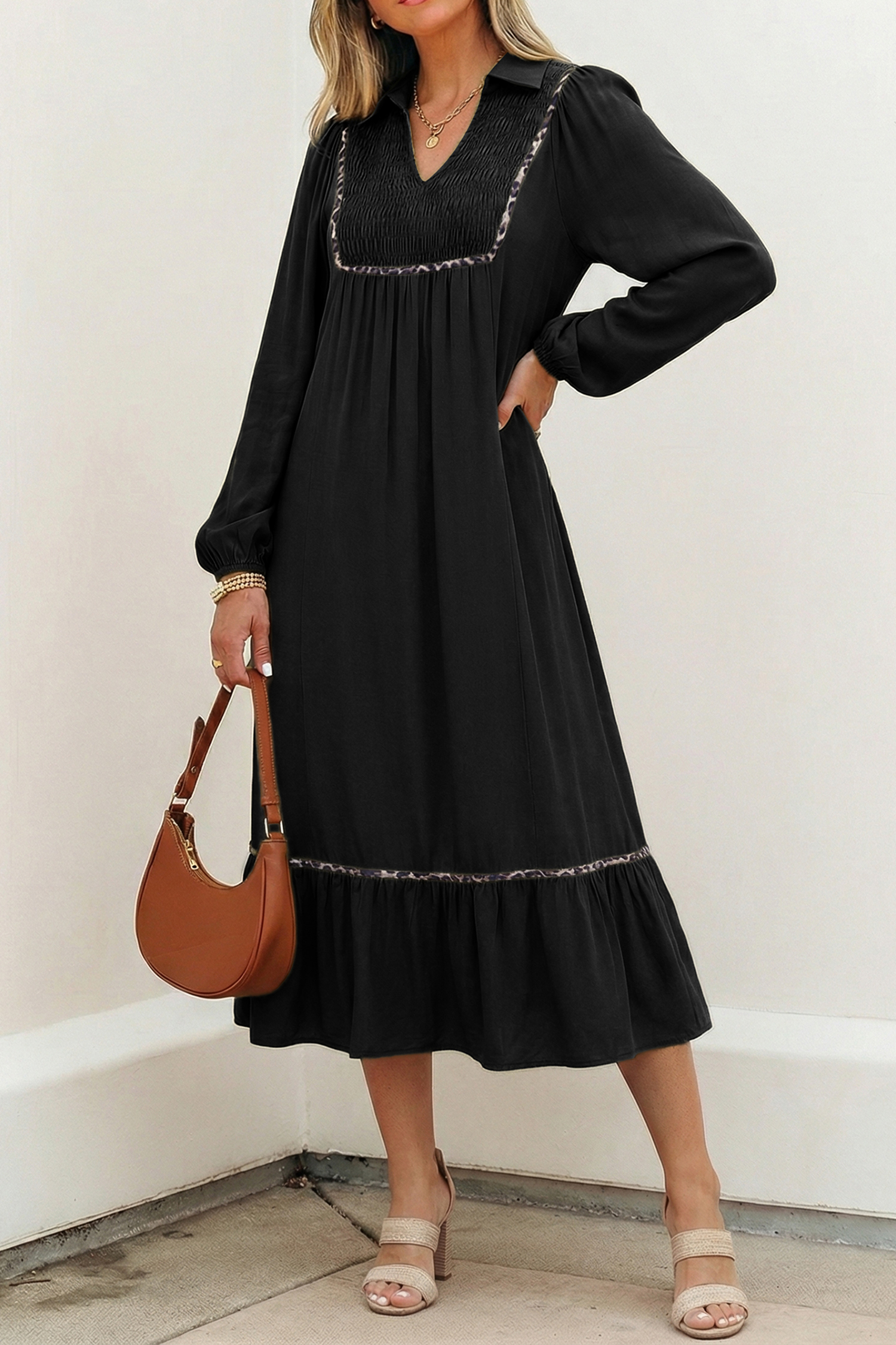 - The smocked detail is chic and comfy while adding visual appeal.