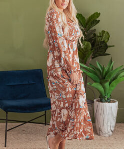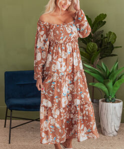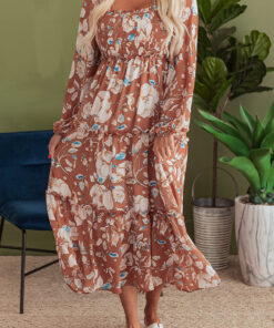 Brown Floral Print Shirred Square Neck High Waist Maxi Dress