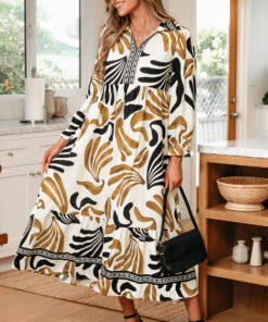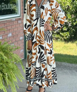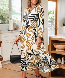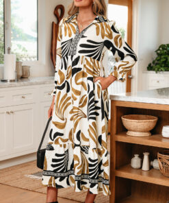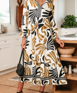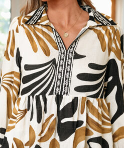 - This stunning dress features a chic patchwork floral pattern in an earth hue