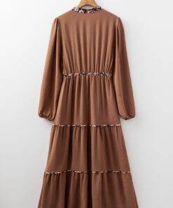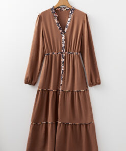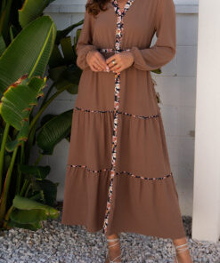- Features a collar neckline, button down front closure, elastic waist and tiered design.