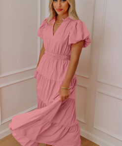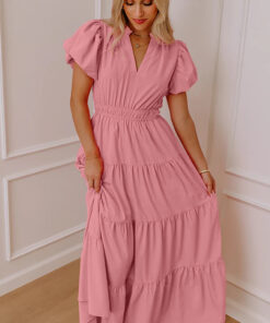 Gossamer Pink Solid Color V Neck Short Puff Sleeve High Waist Tiered Maxi Dress