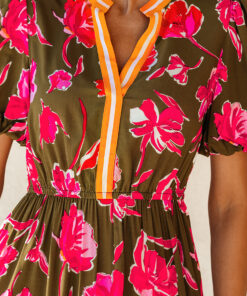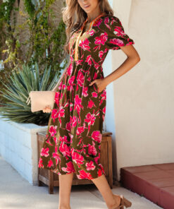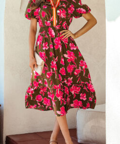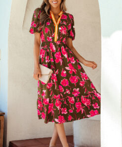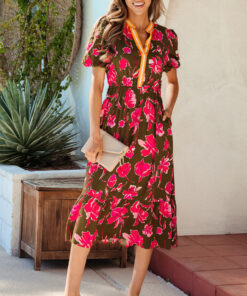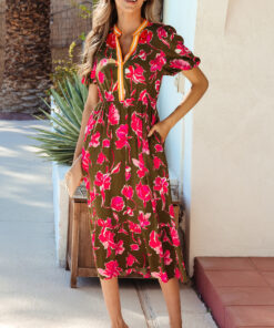 - Floral print creates a romantic look in this split neck maxi dress.