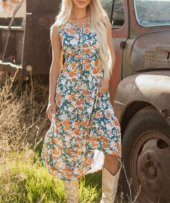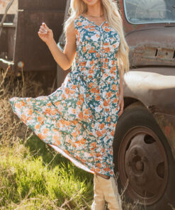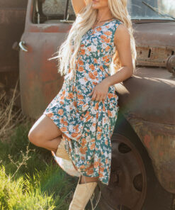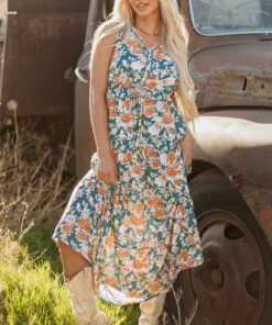 Green Floral Print Trimmed V Neck Tie Waist Sleeveless Holiday Long Dress