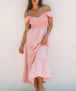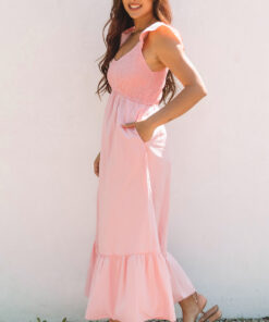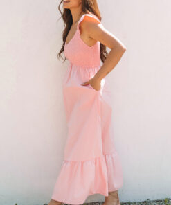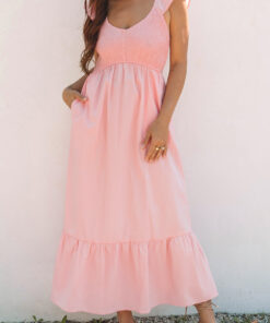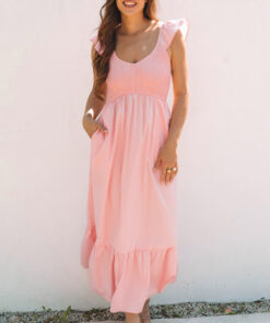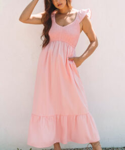 Pink V Neck Flutter Sleeve Smocked Bodice High Waist Ruffle Maxi Dress