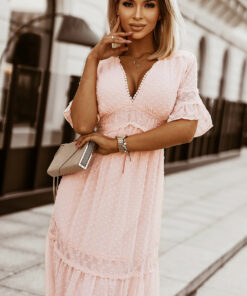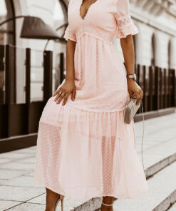 Pink Polka Dot Printed Ruffle Short Sleeve Zip Up Long Dress