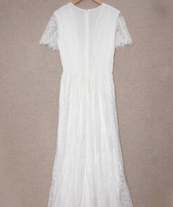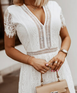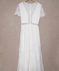- Cut with a v-neckline, short sleeves and a full bodied skirt